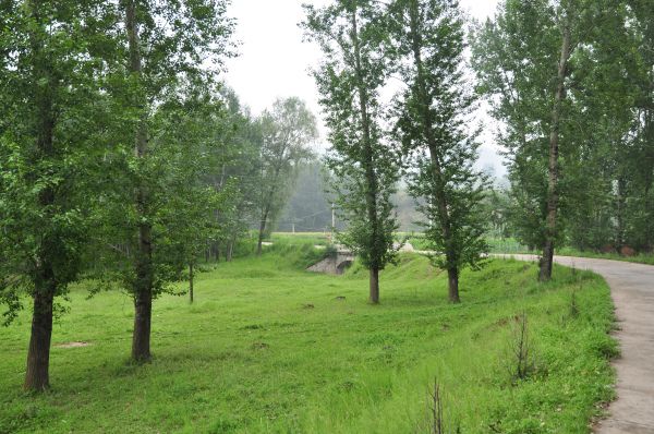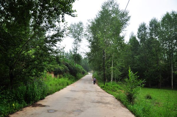 坐上乡间小巴,直接把我们带到了去往尊胜寺的路口。下得车来,一条干净、曲折蜿蜒的柏油路通向远方,两边是蔓延的绿色,绿色的尽头一座高塔印入眼帘,那就是尊胜寺的万藏砖塔了,只见它耸立山脊,层檐叠压,背衬蓝天,十分清秀。