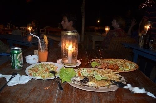 洗完澡,换好衣服,来到沙滩上,这时天完全黑了,在沙滩上星星点点摆满了餐桌,在餐桌上都点着放在玻璃罩中的蜡烛,气氛真的很浪漫,可是只有我一个人独享这烛光晚餐了。在靠近海边的地方,两个黝黑的斯里兰卡渔民正在出售今天刚刚打上来的海鲜,我选了一条鱼,两只对虾,又点了个沙拉,要了一杯果汁外加一份炒饭,把我珍藏的青岛啤酒打开一听,沐浴着清凉的海风,太惬意了,一路旅途的疲劳一扫而光了。等他们把我订的餐端上来,只得叫苦,他们做的鱼和虾都是配了薯条、沙拉的,这是我在斯里兰卡吃的最丰盛的一顿饭。饭后,有些困倦,回到房间,合着外面很响的音乐睡着了。