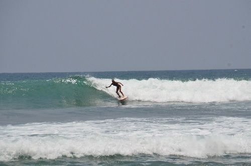 逛完海滩,回来继续睡觉,快到中午才醒,伸着懒腰去吃我的“早餐”,他们做的鱼料的三明治特好吃。沙滩上阳光烈烈的照耀着,晃得人睁不开眼,这里有个一个个的躺椅,真的很佩服那些西方人,他们就在太阳底下享受着日光浴,把自己晒成古铜色,我也要去海里泡泡了,由于之前我在青岛有着在太阳底下游泳的痛苦经历,这次我可不敢去游时间太长,不过这里大海太吸引人了,一天24小时的水温均在20度以上,海水清澈见底,看不到那些冲上来的杂七杂八的东西,不过这里的海不适于游泳,虽然我也住在海边,可是这里的浪太大,是我所没见过的。随便涌向岸边的浪就有2-3米高,是冲浪的理想地方。好多西方游客都在水中练习冲浪,有些人已经能站在冲浪板上了!看着在西南岬角上那些在浪尖上自由驰骋的冲浪手,我也有些心动。下午时分,天上的乌云涌动,阳光不那么强了,这里有个冲浪俱乐部,在那里可以租到冲浪板,我租了一个,800RS,可以一直玩到天黑。其实从早上租也是这个价格,上了冲浪板才知道,这运动的难度系数还是真的挺高,按冲浪俱乐部教练的教法,我先要学会如何在冲浪板上掌握平衡,笨拙的像个在岸边行走的海豹,大浪来的时候,努力的用手臂支起上身,顺着浪滑行,多次被打到海底,冲浪板不知去向!旁边一个从英国来的小伙子,看我这个惨象,告诉我如何平衡、如何压浪花,终于有了些进步。不过他说我要到能站到冲浪板上,至少需要一个星期的练习,我没那么多的时间,这项运动真的挺痛苦的,就这么练了一会的功夫,肚皮全都磨红了,火辣辣的……
