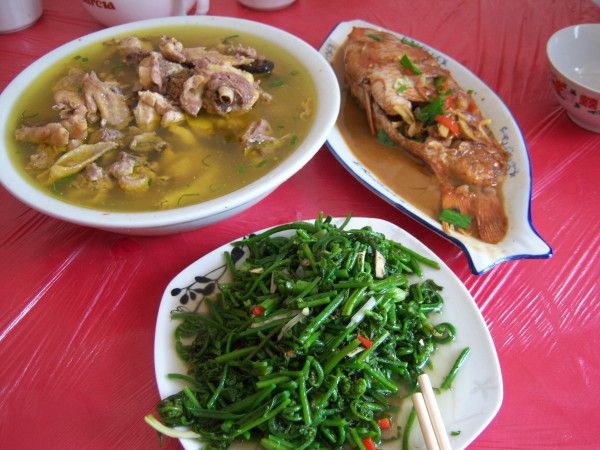 午餐,村民自己养的土鸡、荷包红鲤鱼和水蕨,那只土鸡3斤多根本吃不完,于是打包带走,哈哈!