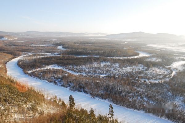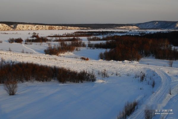 观景照相的木楼居然没开门,绕道进去,攀登上观景楼的顶层,放眼望去,只见冰封的阿木尔河弯延曲折,如银练飘舞,巨龙酣睡。刚架好三角架准备拍照,下面哇哇传来叫唤声,听了半天只听清楚是叫我下去,也不知是什么原因。赶紧抓拍了几张下到底层,原来是看护人说卖票的还没来不让上去。要他代收也不肯,好在我已经匆匆忙忙拍了几张。