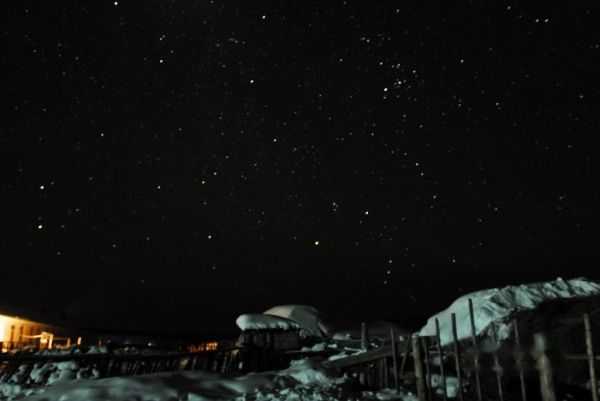 吃过晚饭,心想,既然到了祖国的最北边,那夜空中的北斗星是不能不看的。走出温暖的小木屋,天空中的星星让我惊呆了,全然忘了天气的寒冷。正值农历十一月初二,天空没有月亮,没有城市的光污染,完全是星星的天空,星星的世界,那久未谋面的银河就在我的头上流淌着流淌着。。。特别是我记挂着的七斗瓢星和那颗不会让人迷失方向的北斗星就挂在我的眼前。赶快跑回屋拿出相机,架好三角架。实在太冷,不敢久留,拍了几张就赶紧撤回屋里。