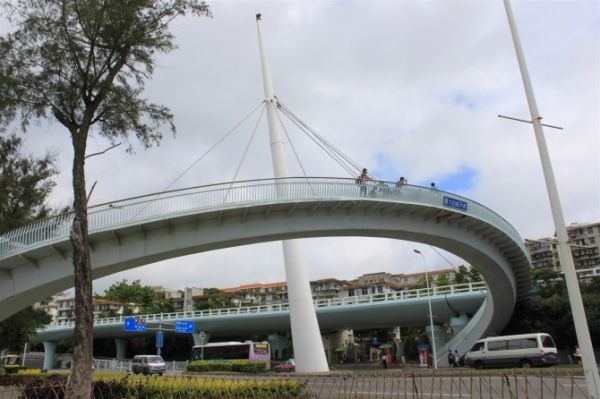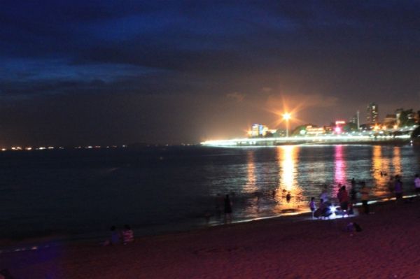 在鹭江道晃了一段,拍了纪念照后,我们决定坐车去白城海滩看看夜景,我再次赞一下厦门的公共交通,真的是随便跳上一辆车就行。来到白城海滩,真的是热闹得很,游泳的游泳,骑车的骑车,我们在海滩晃着,真是后悔没穿拖鞋来,沿着海滩,我们走到胡里山底下的木栈道,从木栈道远看演武大桥,真的很漂亮,白色的灯光,而且很长,像条珍珠项链。