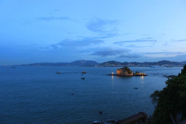 买完饼我们就回锦江了,拿了包裹直接杀到轮渡码头,正好一艘船停靠上岸,真是RP爆发。上船不到几分钟就上鼓浪屿了,一上岸又闷掉了,路真的很乱,凭着直觉、记忆和**一路朝上走,反正我们住的琴海在山顶,往上走准不会错,不过我的方向感还是不错的,从晃岩路一直往上走,就到了琴海,虽然真的是传说中的无敌海景,但是这段路程也是无敌的,大中午的,真是晒死啊。到了琴海等了会才check in,第一件事就是洗澡,我们三人洗完澡,睡了会儿,才悠悠闲闲的下山,出门四点不到,下山路上买了个冰椰子,顺便打听到日光岩7点半前门票半价(琴海距日光岩5分钟脚程,超近),于是乎决定不买套票,反正缆车在修,百鸟园也不能去,也不想去。下山不管三七二十一就是随便走,走到哪算哪,到处都是老旧别墅,真的很有感觉,一路走到海边来到皓月园,进去了,门票是15好像,里面就是瞎逛逛,不到一小时就出来了,登上郑成功像看后面的海景还是不错的,我们正好是晚上天微黑的时候去的,真的是在皓月园看皓月。出来我们就往鼓浪屿的中心龙头路走,饿了找吃的,在原巷口吃得鱼丸,味道不错,不腥,那个炸五香也不错。反正晚上就晃吃的了,一些事前攻略的店都找到了,鉴于没有那么大胃口,决定明天继续,不过鼓浪屿的海鲜价格确实比厦门要贵,要大吃型的还是选择回厦门吃好,轮渡码头对面就是中山路,还是很方便的,反正最后我们仍旧拎了个哈密瓜上山了,在平台上数着星星灰机,对面是亮着灯的日光岩,还有晚上星星点点的船只和那隐约的气鸣声,真的超有感觉。