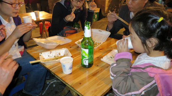 晚上8点多落脚7天连锁酒店 本着节约为本的原则 婆婆爷爷提议就在附近夜市烧烤滩解决的晚餐 一家7人 吃了27块钱 :2盒抄粉 3串烤肉 1瓶啤酒 爷爷和二爷爷说:实惠啊!