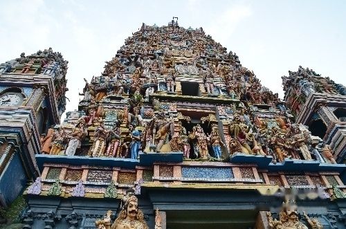 走了没几步,眼前突然一亮,在马路的右手也就不到一百米处赫然耸立着一座彩绘的印度庙,门口有成山字形的三座高塔,中间的最高,差不多有三十多米,门口有许多人在那里忙碌着,他们看到我,欢迎我进去,一个门人引导我到旁边的水池,示意我要脱鞋,洗脚才能进入寺院,和中国进寺院的规矩不同,这个庙和中国的寺院有所不同,进了门,里面只是一个很高的大厅,里面正在做一个什么仪式,在屋角的神龛前,一个穿得像非洲酋长似的的祭司,拿一个椰子打碎了,把椰汁和着颜料往一个在神龛前双手合十的人的眉心、喉咙处涂抹,旁边还有几个人在吹着像萧一样的乐器,另几个人在打着手鼓,过了一会,那个祭司又点燃了一把茅草,领着他们绕着中间的神塔转了一圈,在转的时候,嘴里还不停地诵着咒语。这景象在中国是没有啊,我刚刚要举起相机,旁边一个护卫示意我不能拍照,如果要拍照,得向他交钱,我问多少,他说500RS,我说100RS,他不同意,那就算了不拍了,一会他示意我跟他到塔的那边说话,他说150RS,我可以拍两张照片,也可以啊,没想到这是我此次旅行唯一在印度庙中拍的照片了,由于房内光线比较暗,不好拍,勉强凑合拍了两张。走到主殿的神像前,他们的祭司给我也在额头、喉咙上点上了朱砂红(后来去了印度才知道,这是参加印度教活动不可少的仪式,就好像祈求主神的保佑的意思吧),给了50RS,他们也不计较,出来到了门口,取鞋,门人也向我要钱,50RS,这是我口袋里最小的票子了,我后悔自己没换更小的票子。