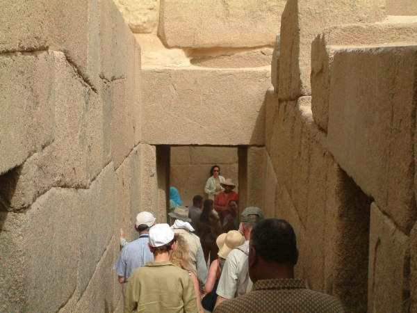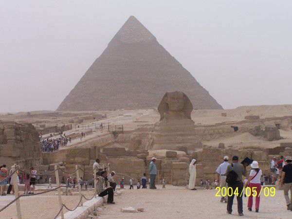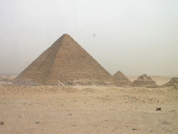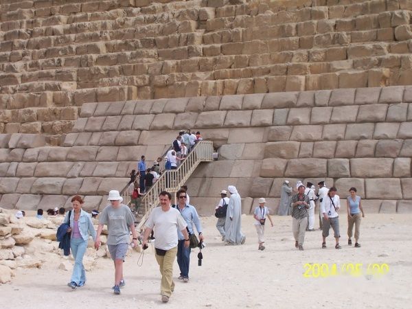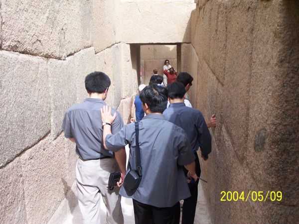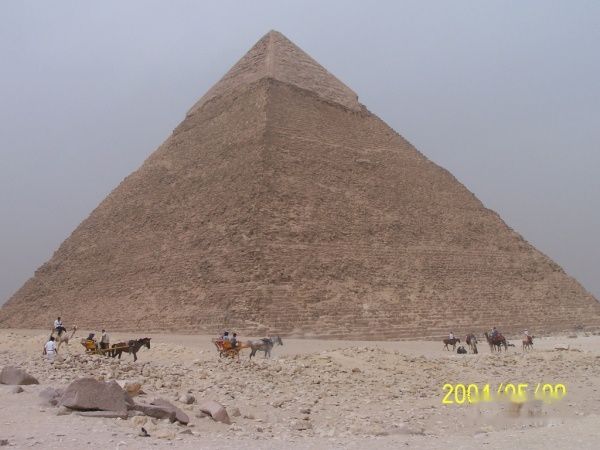 我后面可以看到金字塔的入口,入口处有一巨大鼓风机向里面吹风(把外面几十度的热空气吹进去),入口里面好臭,洞口约一米高一米宽的正方形,一个个排着队向下走,一旦进去半途想出来可不行,我这个身型你就想象吧,折叠后还得跪着才行,估计有200-300级台阶,没几步已经憋得喘不过气脸通红心狂跳(相对象的时候也没这样)再向下走就感到缺氧头晕眼花,正后悔不行的时候,突然出现一个挺大的空间,直起身板来那个舒服啊(终于明白为什么猿人拼命要站起来),打量四下,原来这是个石头门闸所在地,在头顶不远处悬着一块巨大(水果刀叫小刀菜刀叫中刀西瓜刀叫大刀相比下铡刀就是巨大了)的石板,两端用木楔子和粗木顶着,接着向下在还没失去知觉前到达了终点,法老的墓室,里面象套房一样,几个间儿,空的但味道还在-臭,走梯终造成的气喘因缺氧没有缓解的迹象,耐心各个间儿看了一遍(不让照相)迅速返回地面,出来后人就快不行了,倒在车上好半天起不来(真不行,难受,有心脏病高血压的估计会出事)。