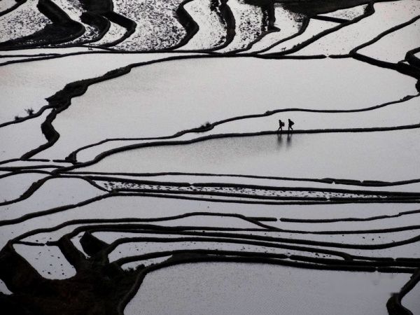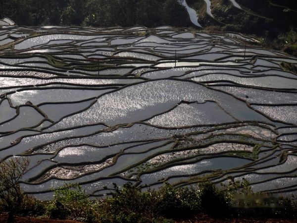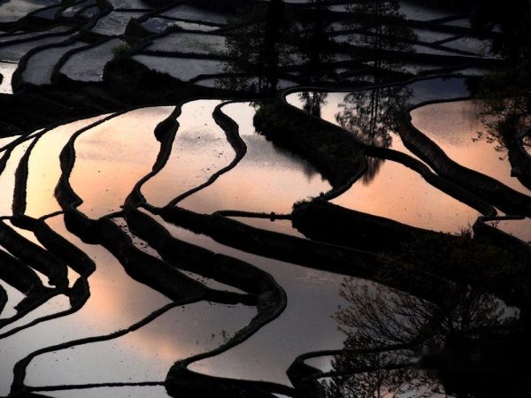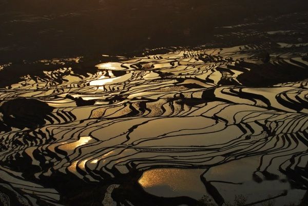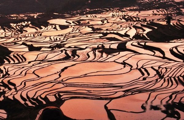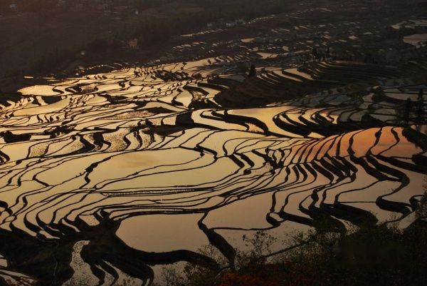 下午4:00与另两个扛着复杂摄影器材的人出发老虎嘴。元阳梯田是哈尼族人世世代代留下的杰作,规模宏大,气势磅礴,神奇壮丽。老虎嘴景区有着元阳最高的观景台,向下看梯田无比壮观!除了立体感强外,颜色的层次感也最强烈,五彩斑澜,像是人画上去一样的,而且周围梯田的坡度也陡些,在最低处的梯田是最吸引目光的地方,其中离视线最远处的那一片,看起来极像一匹扬蹄奋疾的俊马!但是今天有落日而无红霞,梯田的水里没有大家期待的红色。来到这儿才知道,梯田很美,但拍片一定要有天气条件,它是一个不容易表现的主题。