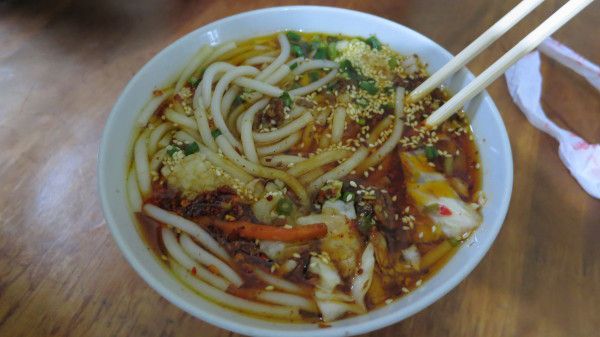 第一班车是8点40分,我们一家到时已经卖光了,于是买的9点10的票,跑到附近去吃米线,5块一碗,味道还行,作料丰富,但是还是比不上我们重庆的小面.