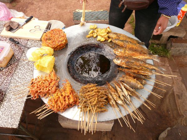 本人吃了2串烤乳扇,味道很香,上面还有点点白糖.炸小虾也不错,不过晚上看见他们把没卖完的收在背篼里,就烙下了心病....