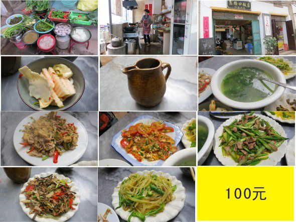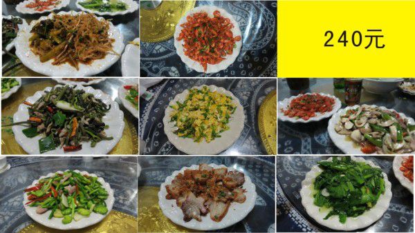 三荤两素一汤,100块.味道不错.当地都是看菜点菜,没有具体的菜名,只要你说,她都可以给你抄,不过味道就不能保证一定是你想的了,我们点的几个菜都还可以,厥菜炒肉推荐.