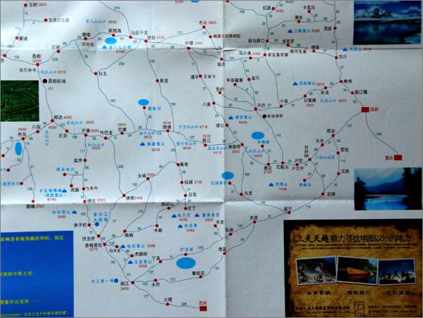 “登巴客栈”的“藏地旅行攻略全图”是牛皮纸做的,古香古色,在我看来就像是一份藏宝图。“邦达青年旅社”的“藏地旅行攻略全图”很现代,图文并茂,线路清晰,方便查看。而且,这些地图的背面印有很多沿途客栈,以及租车的联系方式。如果你在这两个地方错过了买这样一份图纸,那么在亚丁景区门口的一家茶馆里也会有“藏地旅行攻略全图”卖的。我发现,这种很有用的攻略图在那些比较舒适的常规宾馆里都见不着,似乎只有这种背包客喜欢的简易客栈里才会有,这也算是我这次入住“登巴客栈”和“邦达青年旅社”时的一大收获吧!
