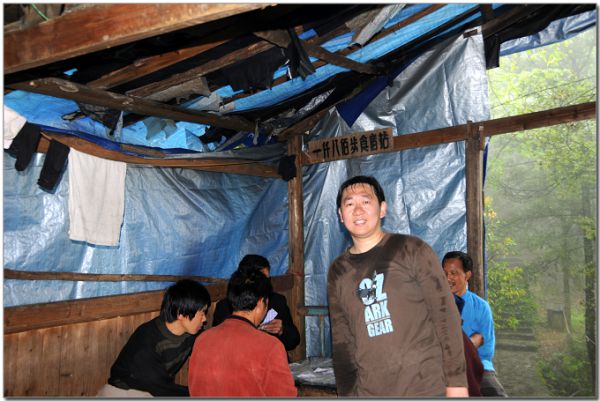 4月29日,是个值得纪念的日子,不仅因为本登莅临(注意:是本登,不是本拉登,世风日下呀,我这样的也敢以登山者自居了),还是南线开山及索道开通之日。南线因修索道,一封就是3年,有多少登山者千里迢迢而来,被拒之门外,有人把索道比作梵净山的一道美丽伤疤,我不想论其功过,只想说一句,你们的这种做法,对天下登山者不公平。4月28日,梵净山旅游节开幕,晚上在铜仁举办欢乐中国行晚会,我算赶上了,也不知道是哪个鸟屎长和北边的哪位鸟领导要来,离铜仁也就20分钟了,居然把路给封了,让走乡村山路、有人性吗?这也叫路,别说大车了,小车错车都费劲,惊心动魄的4个小时呀,遇到一翻车的和一差点翻车的、太没人性了,我算明白了,啥叫:人在江湖飘,怎能不挨刀、啥又叫:人为刀俎、我为鱼肉了。那时候,心态最重要,想想也能理解,人家地儿小,孩子们没见过世面。到铜仁,已经6点了,去江口的公车没了,只好与别人一起包车,1小时路程,上来一贵州大哥,说话到像山东大哥——爽快,“你是去梵净山的吧,别去了,这天儿三天也晴不了,山上什么也看不见,冻死人”也罢,话糙理不糙,人家毕竟是山里的土著,不过,俺千里迢迢,拖着伤腿(在德夯照鲤鱼跳龙门,把左腿摔伤了,在凤凰下台阶,膝盖钻心的疼,自不量力呀,自作自受呀!)…,NND、你说不爬就不爬了?下雨、下刀子顶着锅盖也得上。江口是个不大的山城,今晚就住这儿了,明早还要坐1个多小时车才能到黑湾河山门,从山门还要坐3-40分钟环保车才能到鱼坳零步,这是到达梵净山最捷径的路了,从凤凰出发到梵净山下,除江口住宿一晚,累计奔波9个小时!坐在江口的大街上,吃着当地人都爱吃的干锅,小雨还是淅淅沥沥,此刻,我无语,梵净山,想说爱你真的不容易!