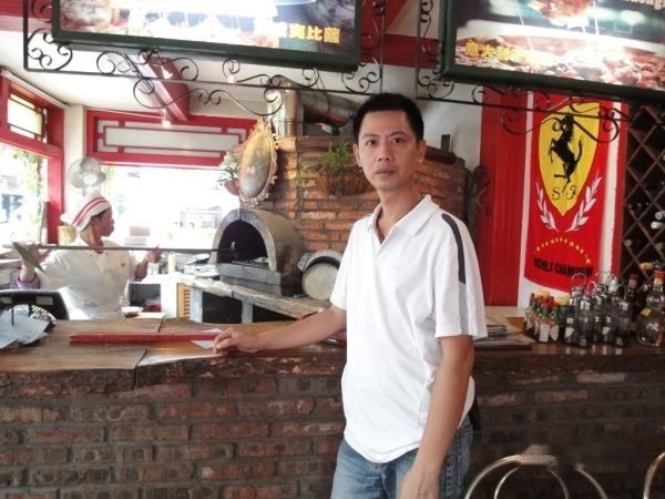 在等待的过程中,偶好奇的去看披萨是怎么样烘培的,所以走到这个烤炉旁边看着厨娘下料、烘培,顺便叫漂亮的服务员帮偶拍照留念,这样的烤炉你们没有见过吧?够异国风情的。。。