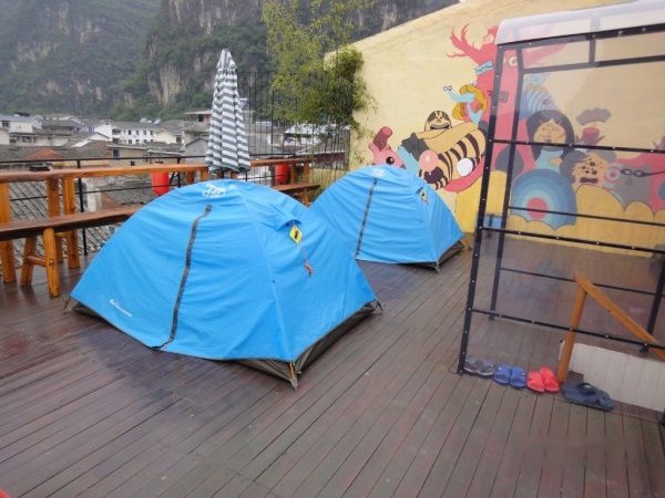 第三天早上醒来,把昨晚换下的衣物交给服务员,坐在大厅喝了一杯免费的咖啡就出门找早餐吃,吃完所谓的桂林马肉米粉,就回去拿洗好的衣物到楼顶晾嗮,呵呵、原来楼顶也住有几个露营的驴友,楼顶给老板搞得很漂亮,经营有一个小酒吧。