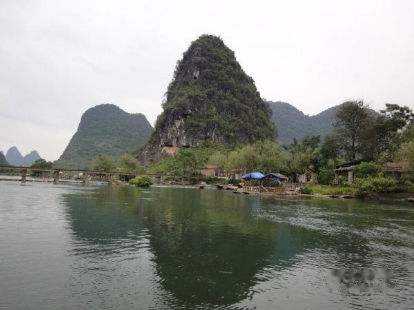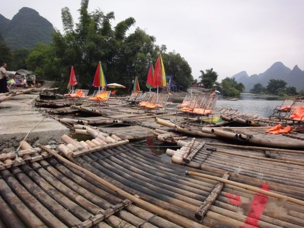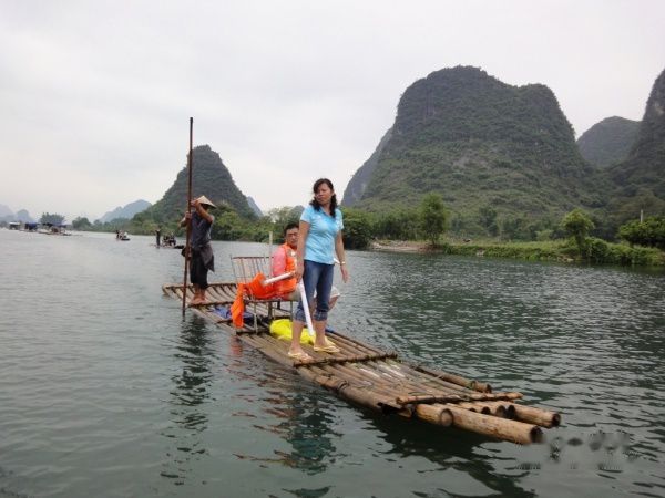 在竹筏看着两岸的青山倒影在绿水中,那个景色美呀,沿途中有一些固定的竹筏,竹筏上的中年妇女在吆喝着游客,推销她们的烤鱼。偶可没兴趣这些,所以专注的看风景。
