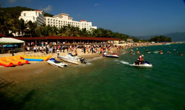 地陪把队伍拉到海南刀具厂,推销者口若悬河,把他的各种产品吹得个天花乱坠,要价奇贵。其实,这一套我们全都见识过,不为所动。穿过长长的、摆满各种产品展销的长廊,没有看见任何厂房和车间(你一定知道其中的奥妙)。我们离开时已经很晚了。最后一个景点是亚龙湾海滨浴场到达时已经是15:39.只给我们半小时拍照。那是真漂亮!海水湛蓝,很气派的白色酒店,成为构图的点睛之笔。在大东海贝壳卖得很贵,而亚龙湾我买了4个才10元。其实,我心中很纠结,既然元月2日就到了亚龙湾,两个景点近在咫尺,安排在一天游玩多好。