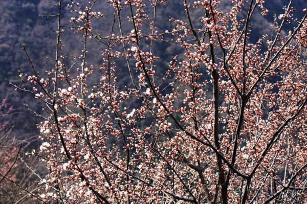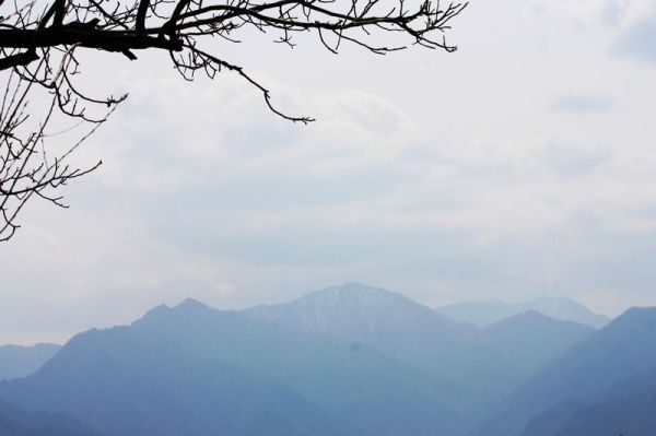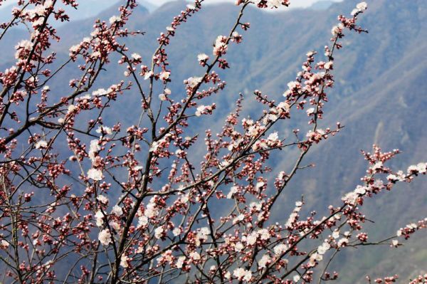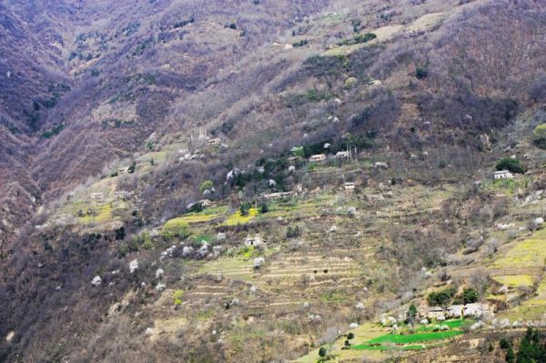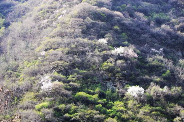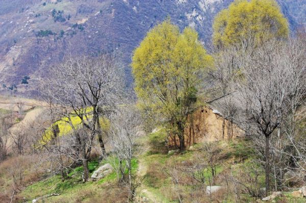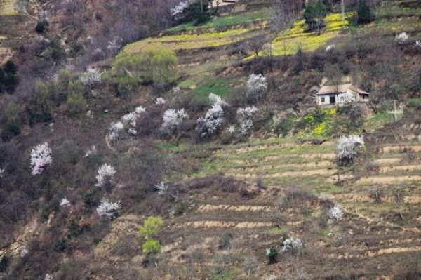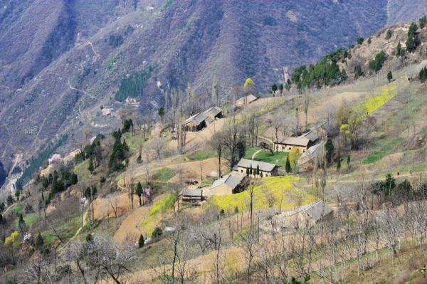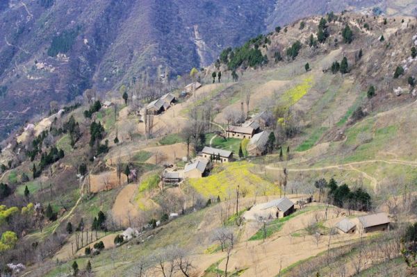 快到山梁时,回头一望,只见广阔的山坡上,阡陌纵横,几户农家小屋,散布山间,一条羊肠登山小道,蜿蜒其中,黄黄的油菜花,红红的山桃花,青青的庄稼和松树,好一幅秦岭乡村的早春图!