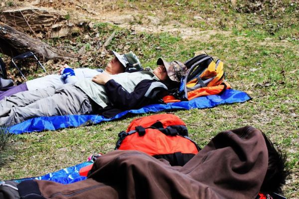 中午时分,在一好像已废弃的农家小屋前的草坪上,大家铺开地席,盘腿而坐,拿出各自的干粮水果,或者炉具菜蔬,开始点火做饭。春日的阳光,暖暖的,虽是正午,却不似夏日的火辣,沐浴春光之中,人变得有些慵懒涣散,一阵水足饭饱之后,人们索性以帽遮面,或躺或卧,天当被,地当床,静享这山中的小憩,好不惬意、逍遥。