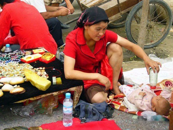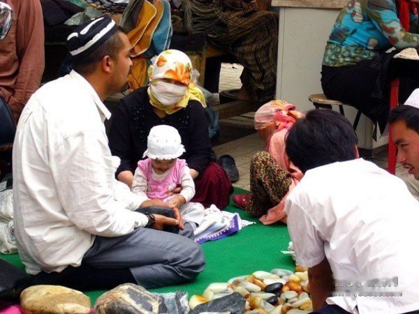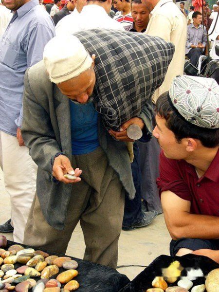细观玉石买卖,各式人群,各色表情。有的全家齐上阵,有的老少搭档,更甚的还有把吃奶的婴儿也带到现场,与待售的玉石摆放在一起,十分有趣。我在**中穿行,捕捉表情,同时也在体验,渐渐明白这就是当地人生活的一部分,就像到玉龙喀什河淘玉一样,而且是很重要的生活组成部分。所以他们倾力而行,全家上阵,从娃娃培养起。他们享受这样的生活,乐此不彼,所以他们快乐。