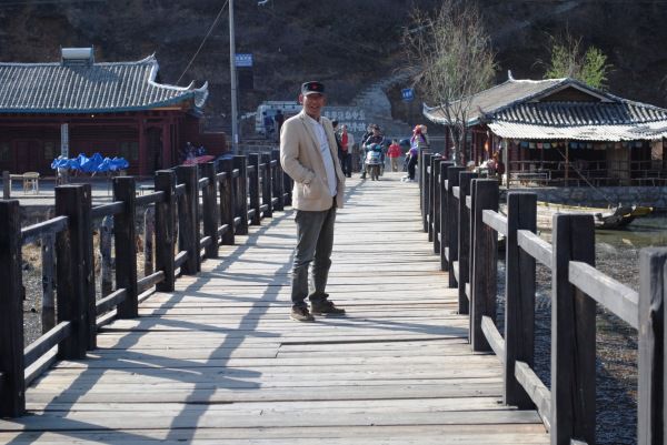 杨师傅早已在桥的另一头等候多时了,当他闯入我们的镜头自然不忘给他一个特写了。这样看他还是相当神采奕奕的。典型的摩梭汉子一枚啦!