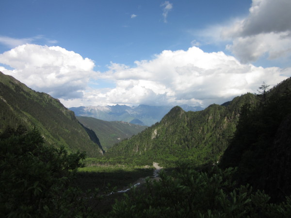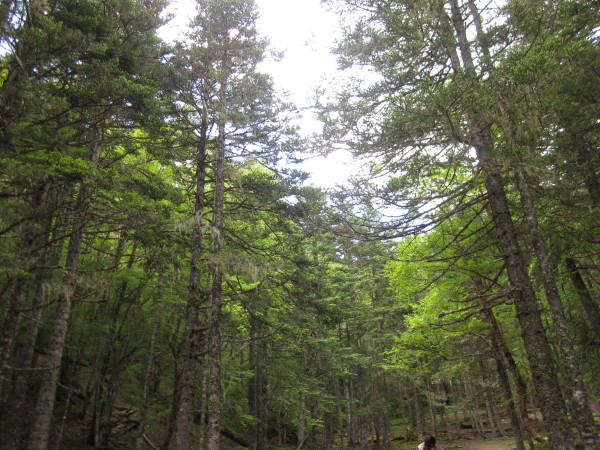 走过上雨崩村的平地,就来到一座山脚下,终于开始今天的爬山之行了。说是山,其实也就是个小丘陵,反正我走起来倒是毫无压力。一路上,我们都是在原始森林里穿梭,有大片大片的杉树林,千奇百怪的姿态。有溪水从雪山上留下,冰凉、透彻。林中的鸟儿不断的啼叫,却难以找到它们的踪迹。地面上,经常有牦牛与我们相伴,擦肩而过。在这样的地方与队友们聊天,说笑,真是有一种悠闲惬意的感觉。