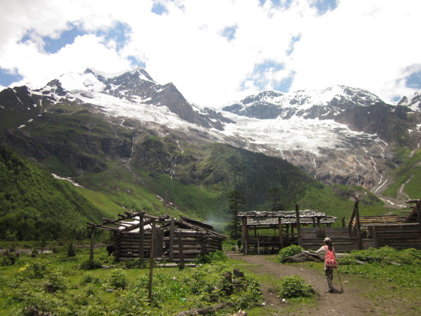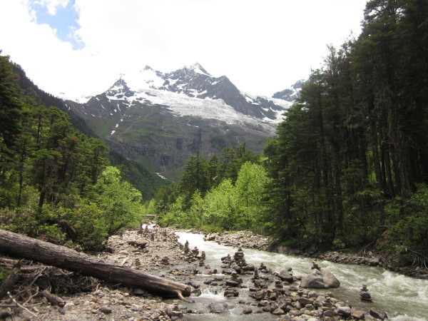 沿着上图的河流再走一段路,就来到了我们今天的休息站,笑农大本营。这个地方原是当年中日登山队为了攀登梅里雪山所建,现在被藏民们辟为徒步者的休息站。在这个地方,无论是瞻仰眼前的雪山,还是欣赏身后的森林,都是绝佳的观赏地方~