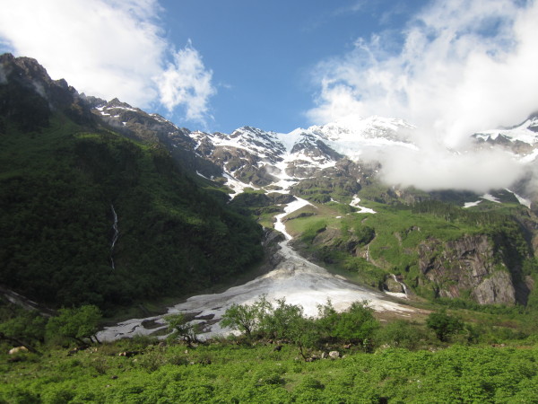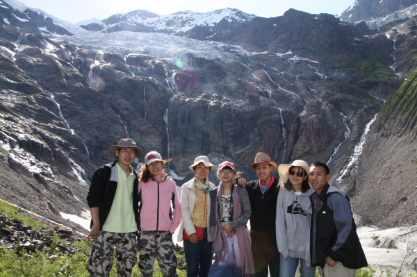 人生总是充满了遗憾。当我们来到冰湖时,她却被一个月前的雪崩所掩盖,只露出冰山一角让我们去遐想她全貌时的美丽,但这并不能冲淡我们的激动的心情。面对着这近在咫尺的雪山,忽然有一种天人合一的感觉,这景色太壮观太美丽了!