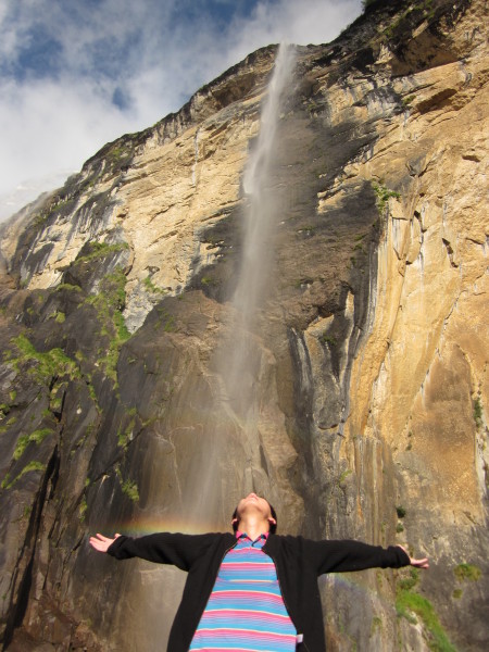 第二天早上六点天还没亮,我和小牦牛就出发前往神瀑了。走神瀑需要从雨崩上村赶到雨崩下村,然后向去冰湖那样先翻过一座小山,再爬上一个坡,就到了。经过2个小时的跋涉,我们俩终于抵达了神瀑。在我面前,只见一股清泉从雪山高高的悬崖上坠落,在阳光的照射下,一道美丽的彩虹横贯瀑布而过,并随着水的流动而不断变化,美丽的神瀑!