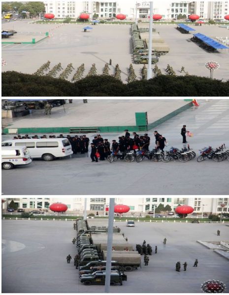 从宾馆房间可俯瞰市中心广场,大队的武警战士正在操练。