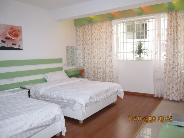 在网上查到杨姐(138 7837 5465)家的青春花园家庭旅馆不错,订了一个标准间,提前给杨姐打了电话,杨姐的老公郭哥开着面包车到车站来接我们,我们的房间在二楼,房间布置得非常温馨,卫生很干净,空调、热水、独立卫生间,液晶电视、吹风筒都有,客厅还有一个公用的洗衣用的脱水桶。从房间的设置可以看出房主花了不少的心思。