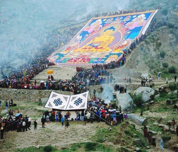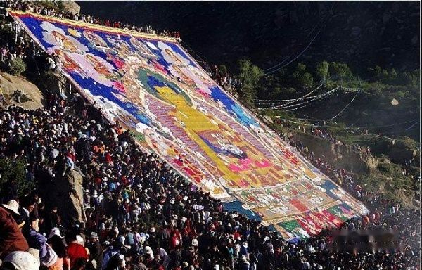 藏历六月三十日为“哲蚌雪顿”,这天,哲蚌寺的僧人们要在根培乌孜山上挂出一副高三十米、宽二十米的巨大佛像唐卡供人们瞻仰,引来大批信徒和游客前来祷福,场面十分壮观。无缘看到当时情景,特转载几幅晒佛的照片,可见当时场面的壮观: