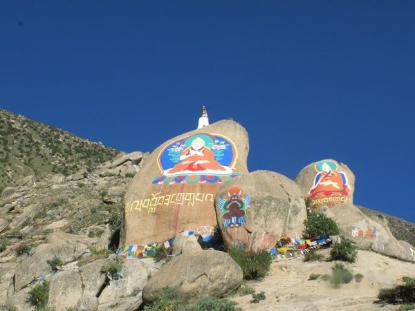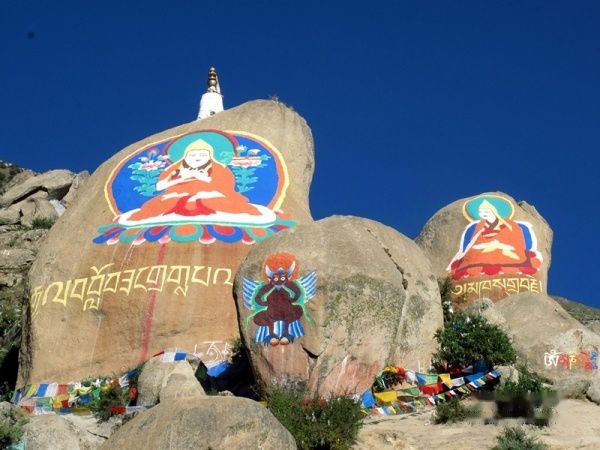在哲蚌寺的西侧我们看到山坡上的巨大彩石,石头上用彩色颜料画的佛像栩栩如生,令人惊叹!