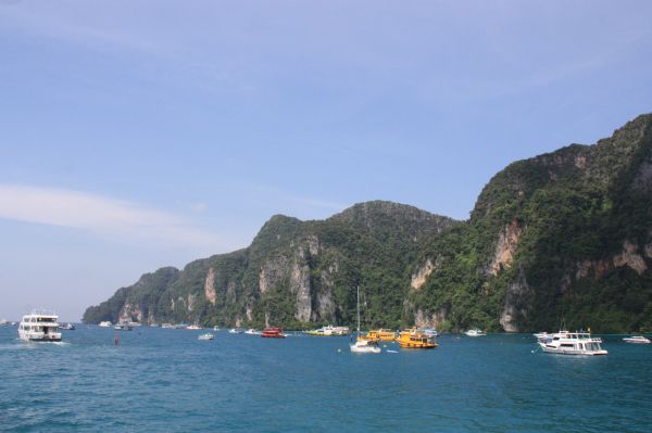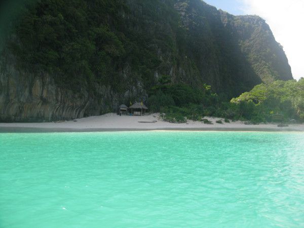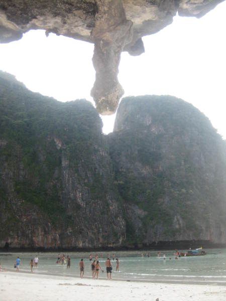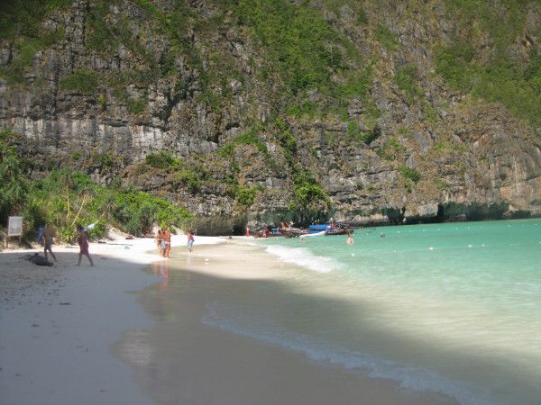 第三站玛雅湾(Maya Bay)上岸要200b:海湾不大,三面环绕着高达百米的绝壁,只有一个狭窄的出海口,就像是一处与世隔绝的人间仙境,莱昂纳多·迪卡普里奥主演的电影《海滩》就在这里取景。海湾远看很漂亮,沙子是白的,水是绿的,脚丫丫踩在上面感觉沙子细如面粉,超超级舒服啊!我们快乐地在海滩上欢呼、奔跑、跳跃、泡海水、玩沙子,细心的阿龙用我们的相机为我们记录下了这一切,并且还把情人海滩上的秘密留在相机里,回来后才惊喜地看到。