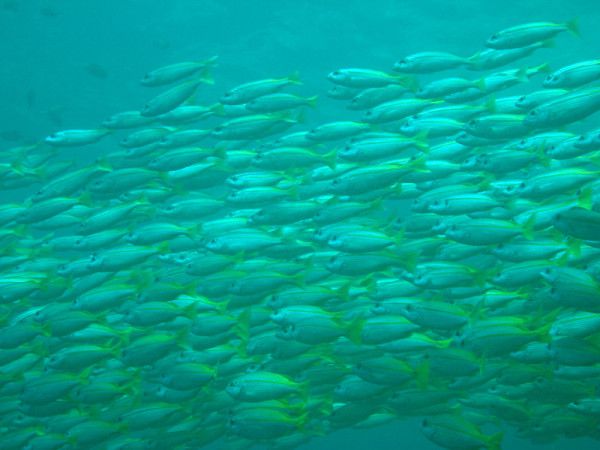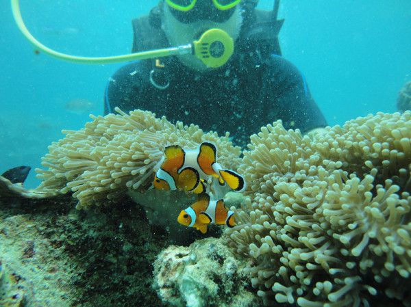 刚下海先是面罩会进水(按教练所教的排水方式排水问题不大),然后就是耳鸣非常厉害,耳朵很疼(不舒服就掐鼻子用耳朵出气减压,千万不要反复上去下来,这样更难学会深潜),阿龙每次要下潜一个深度都会询问我们ok不ok,让我们慢慢适应水下压力。潜水时间久了,喉咙会干痛,火辣火辣的(克服一下就适应了)。潜入海里就是另外一种景象,各种各样的鱼儿们悠哉悠哉地游来游去,很是逍遥自在,还有各种珊瑚,如花般盛放的软珊瑚整片整片地随着海浪收缩摆动,美极了!!阿龙带我们游进一处海底洞穴,里面成千上万条透明的银色小鱼,感觉会发光,好壮观啊!!看得我眼花缭乱,不由自主的伸手去摸,鱼鱼躲开了,等我收回手,鱼鱼又游近,海底世界对我来说是那么的新奇、神秘。