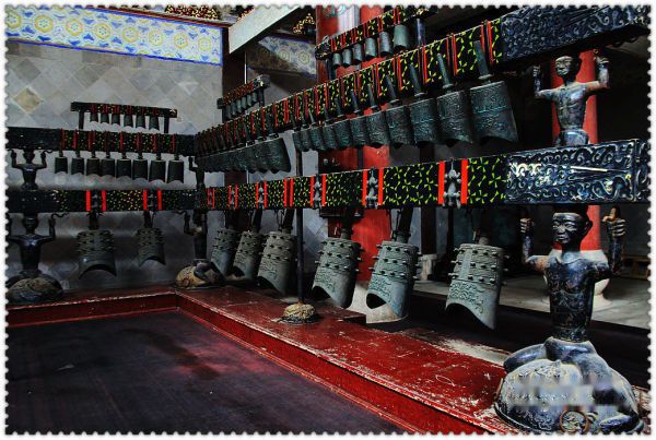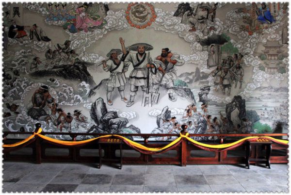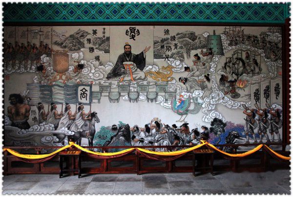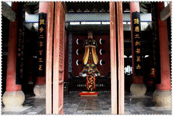 跨进殿门,禹王圣像映入眼帘:兖袍冕旒,双手捧圭,神态端庄。像后绘有九把斧头,象征大禹疏凿九州的丰功伟绩。站在先圣面前,溘然,感觉到自己藐小,小的像尘间微粒,沧海一波,小的像三千若水中的一瓢,满目青木中的一株。大禹,皇帝,衣衫犹如凡人,与黎民百姓并肩奋斗在火线的首级,从古至今,无人能与之等量齐观。