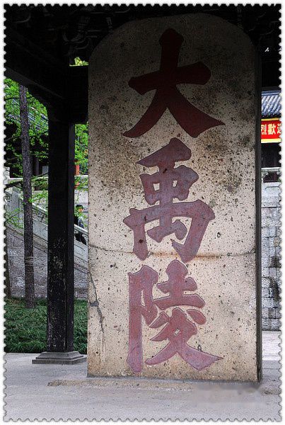 “清晨入古寺,初日照高林。曲径通幽处,禅房花木深。”穿过绿荫包裹着的甬道,可见碑亭一座,亭内一碑,高有丈余,宽可五尺,厚达八寸,上刻三个朱红大字:“大禹陵”。每字齐胸高下,笔力道劲端庄,气势非凡。