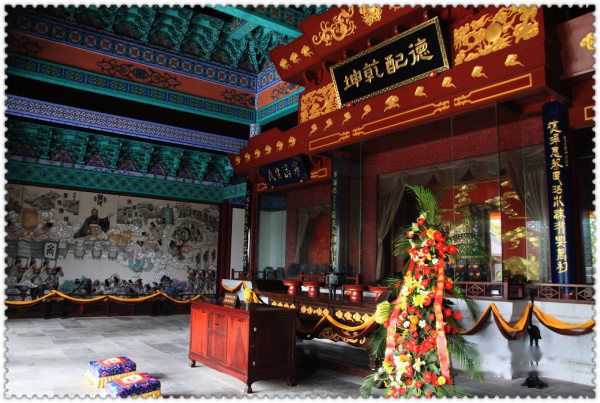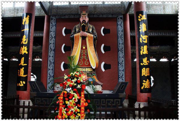 神台前,巨梁大柱粗可两人合抱,上书一副康熙大帝所撰楹联:“江淮河汉思明德,精一危微见道心”。