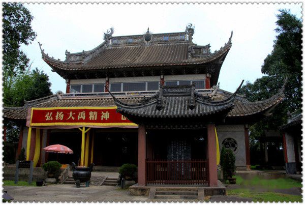 禹庙,南北向。在其中轴线上,自南向北,自低往高是:照壁、峋嵝碑亭、午门、拜厅和大殿共五进院落。从祭厅朝北仰望,那一座座厚重的朱门,那一道道高高的门槛,使你未进禹庙之际,顿生高山仰止,如步天梯之感。
