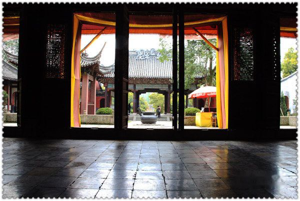 穿过午门,经过一院落,登上“百步禁阶”,便来到“拜厅”。 这历代祭祀大禹的场所,这当年秦始皇南巡上会稽首开祭禹先河的地方,如今只能从那被风雨侵蚀得依稀难辨的对联中,才能看到昔时的辉煌。“箫鼓尚陈今世庙,旌旗犹镇昔时宫”。面对他,仿佛几千年的漫长而陡峭的历史在我们的眼前静静地流淌。