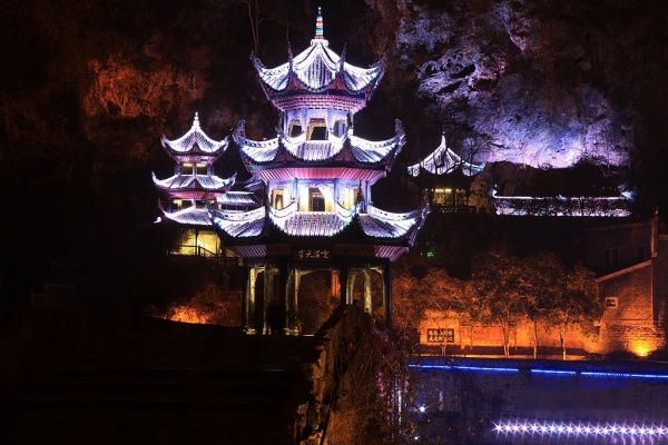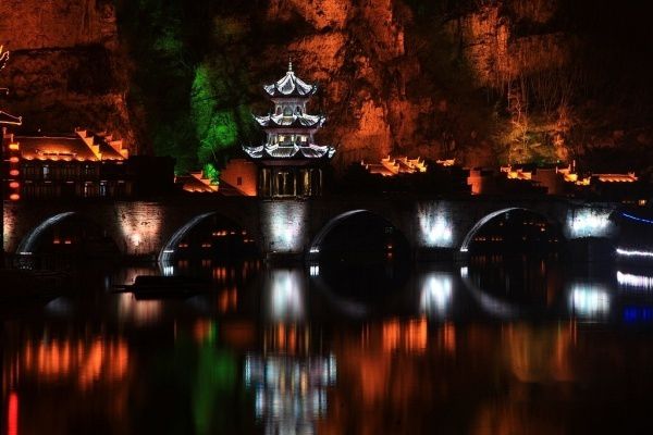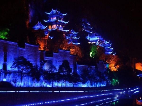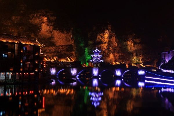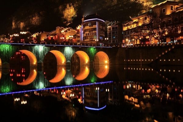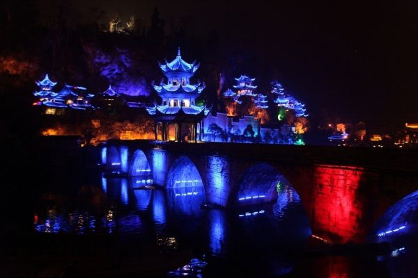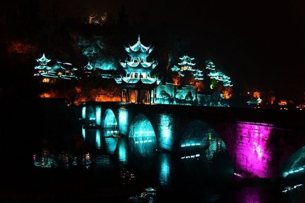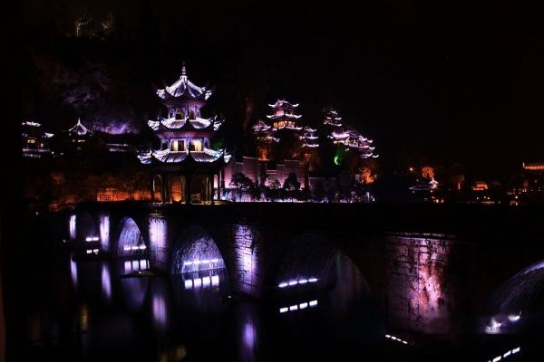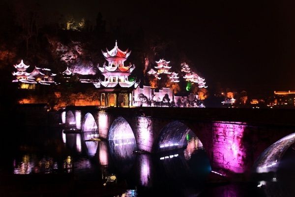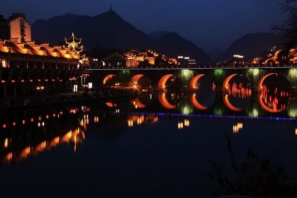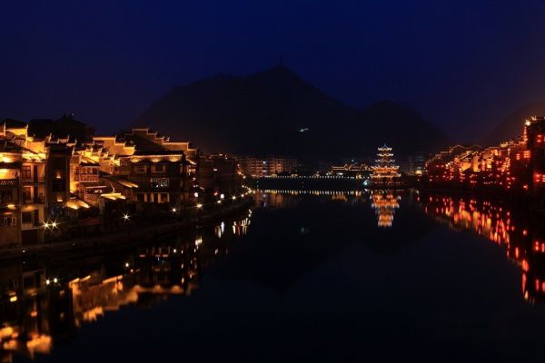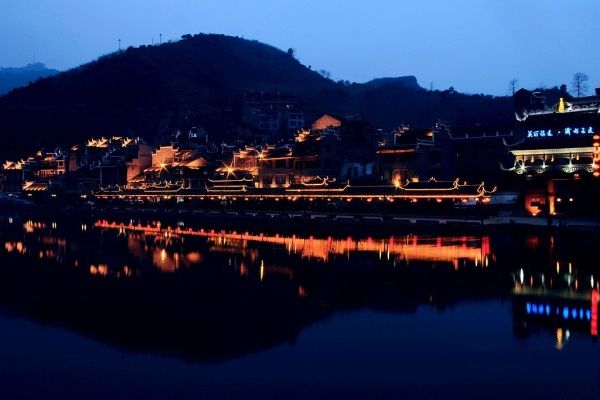 舞阳河,古城魂,河水清澈,碧如翠玉,像一条绿色的丝带紧紧地束在古城的腰间。入夜,舞阳河也是静静的,静的可以听见河水呼吸,惟有春风漾起微微碧波,轻拍两岸,低述着古城千年的往事。岸边,芳草萋萋,青青杨柳,如少女细嫩的腰肢迎风招展。白天不显山露水的古桥成为主角,桥洞内闪烁的彩灯,在河水映衬下光彩夺目,绚丽多姿。错落有致的民房楼阁,连接两岸的古老石桥,携那辉煌的灯火倒映水中——水中的镇远和岸上的镇远同样生动。