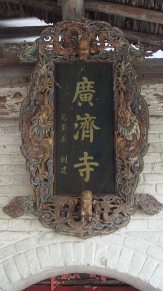走出旅店所在大院,拐到街面上昨晚所看到房屋的前面,一扇破破烂烂油漆斑驳的绿色大门旁,悬挂着一块牌子,上面的文字“广济寺”印证了我的猜想,昨晚看到的果然是一座寺庙的大殿。推开大门,门洞里胡乱堆放的杂物和寂静的砖铺小路仿佛在诉说着这里的寂寞。