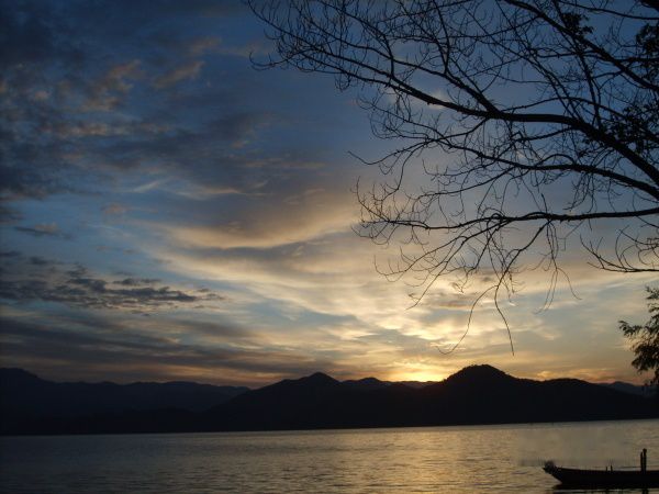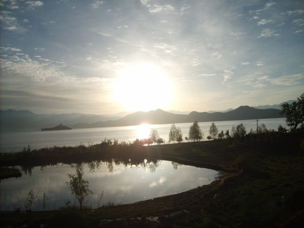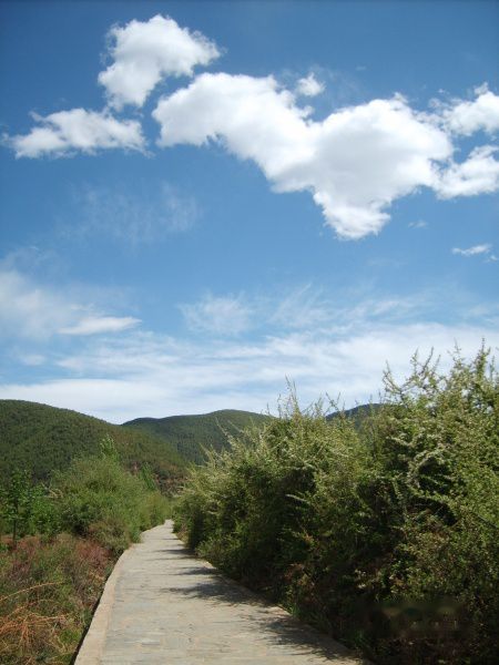 走回到大落水已晚上19:30分。早上大落水6点出发到晚上19:30走了整整一圈泸沽湖又走回到大落水。全程约70公里左右。当晚举步艰难。腿酸痛不已。第二天休息了一天。去吃饭时都轻轻的缓缓的走。昨天一天走得真过瘾啊。回去时又坐来时的司机开的车。泸沽湖到丽江的车是早上10点.12点。我买的是12点的车票。卖票的说其实跟10点发的车差不多时候到丽江。因为这趟车中途不停车吃饭。在客栈门口等车就行。班车就停那到时间再开到车站(就在泸沽湖边道路回头的十字路交叉处。)。我昨天在站里买票时声明说要坐最前面。坐司机并排车门旁边。以为那是一号座其实是加座既最大数车号。刚开始还不错视野很开阔。前面右边的沿途风景都尽收眼底。到了下午3点左右太阳热烈起来就受不了了。太阳直直烘晒全身。热得不行。道路崎岖坐最前端瞧得头晕眼花的热得只好把伞撑开放在膝盖前。司机笑我。没见过坐车挡伞的。:-):-)。中途停车休息时。司机叫了车上他认识的一个僧人跟我换了位置。一车有十个左右红衣僧人。据他们说是从小出家就到印度学习修行。几十年了才从印度返回刚回到家乡(回来就是大法师了)。这次去丽江开法会。司机姓杨摩梭族人。为人很健谈。他说他一大家人都是母亲姨妈阿姨姐妹们及她们的孩子们组成。舅舅们都努力的赚钱负责抚养孩子们。他很欣慰的说,孩子们都很尊敬孝顺他。他回去孩子们都倒好洗脚水端上热茶对舅舅很是尊敬。谁家的孩子穿得破烂别人会说那家的舅舅没本事(不会说父亲没本事)家庭成员以母亲方面血缘为主。走婚其实也是双方有感情的固定伴侣。万一感情破裂了才另找的。我问那男人自己的孩子是谁知道不。他说有的知道有的不知道的。并不象我想象的那样今天走这家明天走那家(-。