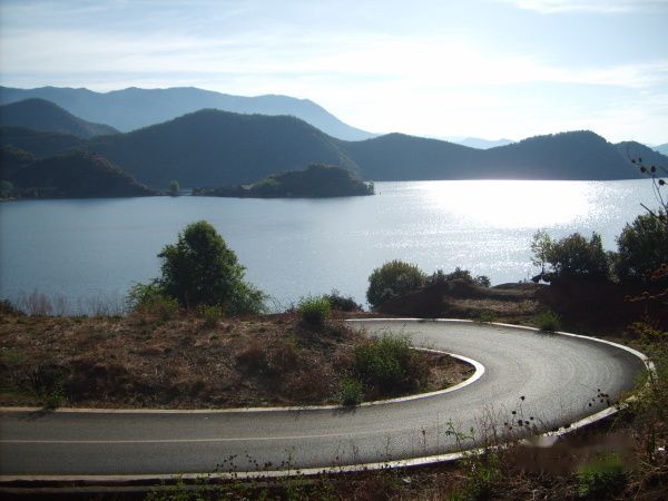 丽江早上8点出发大概六小时抵达泸沽湖车票77元。最近泸沽湖到处在修路。丽江出去大约1小时的一段路很颠簸灰大。一路山路十八弯的爬完这座山爬那座山。山脚到山顶山顶又到山脚。。。都说云南的司机技术很过硬。确实如此。公路有些狭窄。会车时司机彼此商量着擦车而过。路上遇到几个骑自行车的。很是佩服他们。这样的爬山公路走着比骑车来得快。