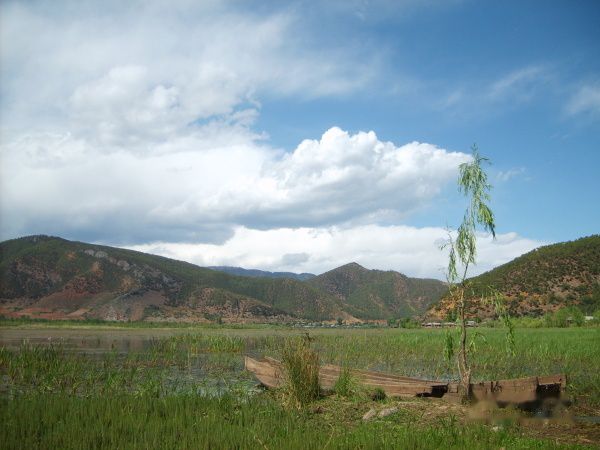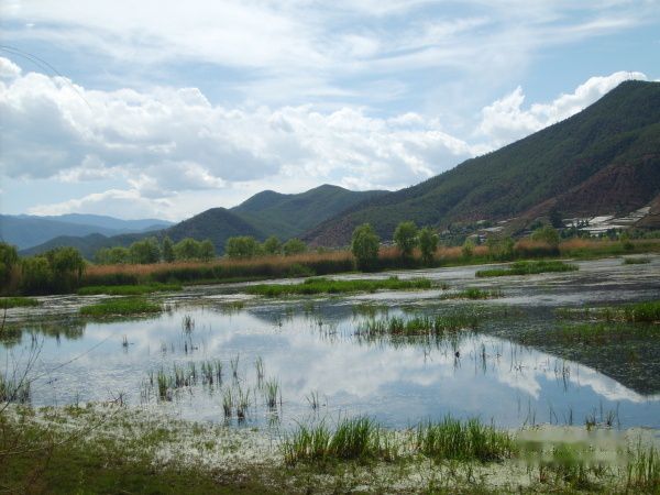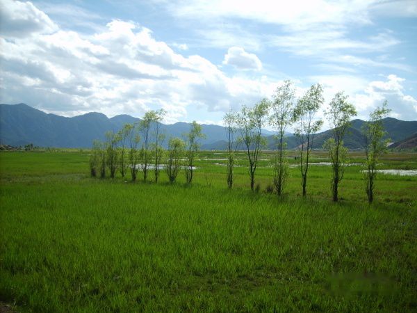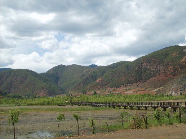 栈道过走婚桥木桥又到公路了。这段时间修路很多旅游团就到这里就返程。其实再过去一段路才是真正意义上的草海。很漂亮青翠的大片绿草铺展开来。