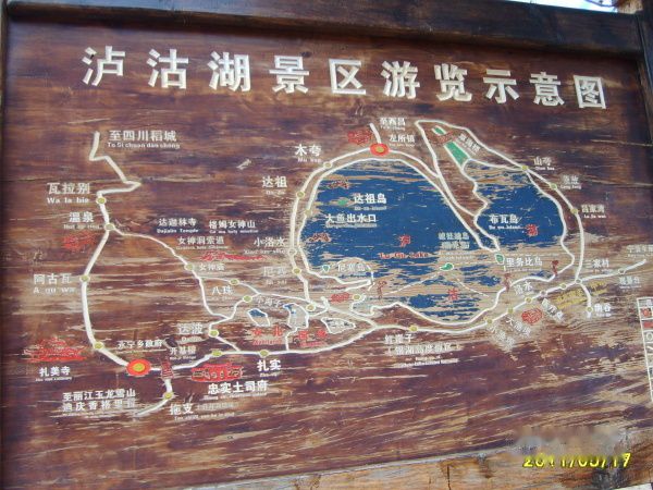 一头走进了低矮的茶树林里。地面上腐烂的黄色落叶遍布。到处好像都是路。低头迎着防不胜防的丝丝缕缕的蜘蛛网潜行。好像光线越来越暗了。不对头哦。只好放弃近距离湖畔乱行的打算。又往上走。见到了上面那条小山路。有段路塌方一大堆黄泥沙从公路旁倾泻而下。好在路段不长。一脚脚深深踩进泥里走出了一串脚印。(这一段可以不用走公路。推荐不熟悉路的还是一路顺着公路走。湖边很多地方走不通。)走了段公路看看下面湖边有路啊。满心里打算尽量不走公路走湖边(又省路程又看风景)。又沿着公路边崩塌的泥沙滑到了湖边。走了一段见湖边扔着很多啤酒瓶还有火烧过的痕迹。大概有人在湖边野炊。湖边的洞里居然分隔不远有两只腐烂了的猪羊。不知道是被人偷来烧烤还是野兽拖进的洞里。赶快的踩浅浅的湖水绕了过去。看看前面好像没路了全是水啊。回头吧不甘心。可能往上爬绕过那段山壁就又到湖边了吧。手脚并用的努力往上爬。上山容易下山难。真的是深有体会了。一回头。又陡又直的山壁想回行是绝对不可能了。不小心就会掉下去。这段山壁不知道要绕到哪里才是尽头。打定主意直接往上最短距离直爬好了。虽然也是望不到顶但总有到顶的时候。左手抓着草根或树根拽几拽掂量掂量。不行就换另一把再拽几拽再掂量。再放上脚试试。一时大部分重心在脚上。一时大部分重心在手上。有时抓到的石块碎落下去惊上一把。继续更加小心的放好手脚。做好了掉进湖里的思想准备。虽然不给在湖里游泳。但也只好如此了(水深还好了。要是水浅。。。不去想了)走踏实现在的每一步。专心的往上爬不去看下面。有时目光欣慰的看到几米处的大拇指粗的横空长出的树。轻轻抓把杂草朝树根荡过去再踩上树根歇口气。真想哭啊,手机也没信号。报警号只好存在心里。寻思着哭眼花了更加快掉下去还浪费力气。所有的退路都没有了。只能往上爬。那就爬吧。更加专心一心一意的搜寻可靠点的草根可以落脚的地点。手脚都酸疼微颤起来。不知道爬了多久终于看到顶了。更加小心的沿着倾泻的泥沙爬上去。这个时候万一大意掉下去才叫冤啊!这是一座还在修建中的金光闪闪的藏庙。感恩的拜了几拜。走下去才知道这里是杨二车娜姆花房处。