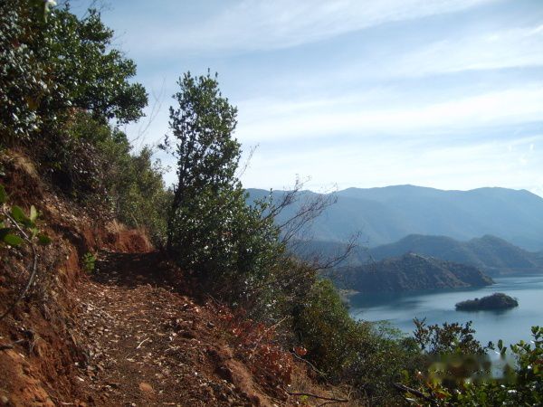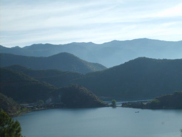 公路转下几个弯就到里格。8点半到里格吃早餐买好水。沿湖顺时针继续前行。走到山脚没有路了问了渔民说往上爬上去就是公路。走在山路上回头看泸沽湖