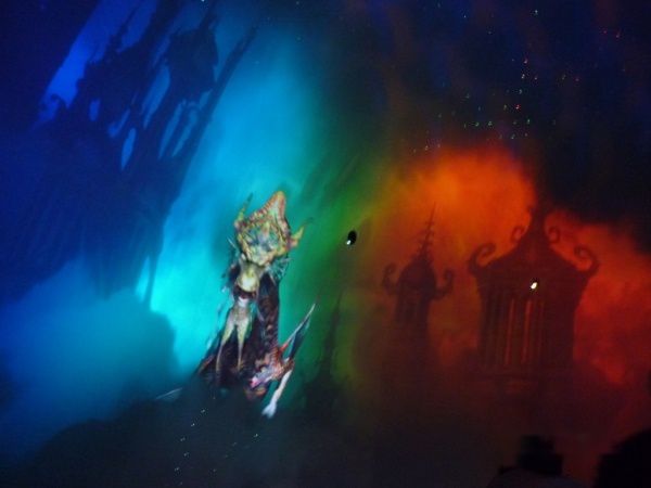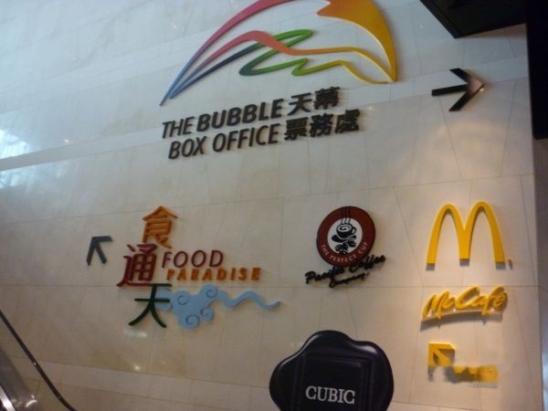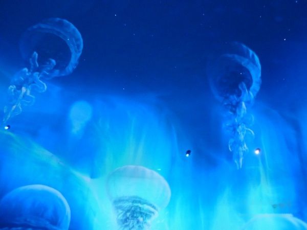 天幕剧院《龙腾》表演,非常推荐!晚上7点前每半小时一场,之后一小时一场。大约15分钟,买门票就要30元,消费100元可换免费门票一张,最多可领8张。不用对号入座,排队进去站着就行。说是讲述了龙珠和它赐给四大龙王神秘力量的故事,我基本上没看懂,只是惊叹它的效果。海里的鱼儿、水母很像在水族馆里看到的。光影图像在头顶和四周墙上,所以人墙也没怎么挡住观赏。一直仰着头,还得转来转去看,因为这些龙飕飕地游得飞快。一场下来,脖子真酸,后来是用手托着脖子仰头看的。