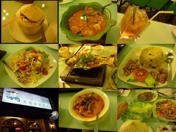 Tutu车是泰国的一种交通工具,类似我们这里的带马达的三轮车,这个店面就很好记。同行的朋友很喜欢吃泰国菜,于是姐姐推荐附近的这家笃笃泰国美食,很正宗。 我也很喜欢泰国菜的,就是这顿饭把我吃撑了,我除了大吃特吃桌上的菜,冬阴功汤、菠萝炒饭、鸭、鱼。。。末了,还喝光了一个青椰所有的汁和肉,还有一杯桂圆汁,冰的,同伴不能喝,我想不能浪费了,这么爽口的。好了,回去坐也不是、躺也不是,折腾到11点吃了保济丸和一种不知名的特效药,才入睡。我以后再也不敢暴饮暴食了,她们罚我第二天不能吃高朋满座的早饭,中饭也只能喝粥,哎哎。