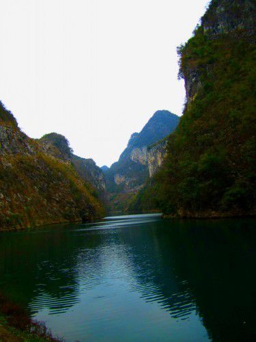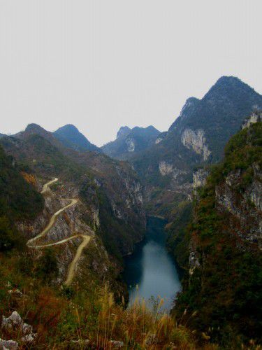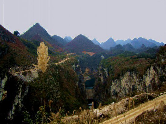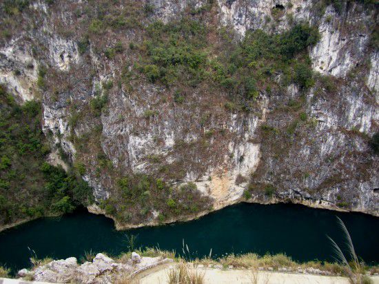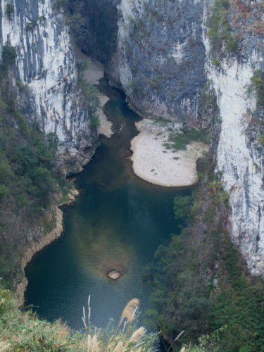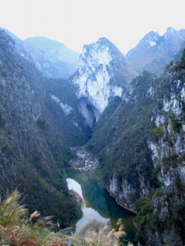 还没到汛期 水有点干 我们想下去来着 但是问了当地的老百姓他们说这个必须从上游划着船才能下来 我们顶多只能到半山就不能下去了